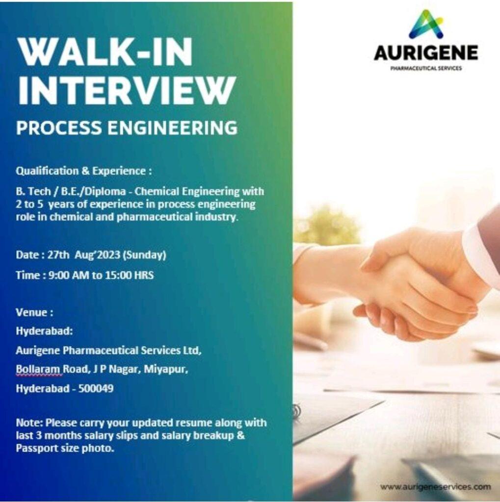Aurigene Pharmaceutical Services Ltd Walk In Drive on 27th Aug 2023 for Engineering department