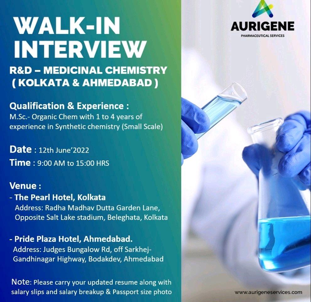 Aurigene Pharmaceutical Walk In Interview at Kolkata & Ahmedabad on 12th June’2022