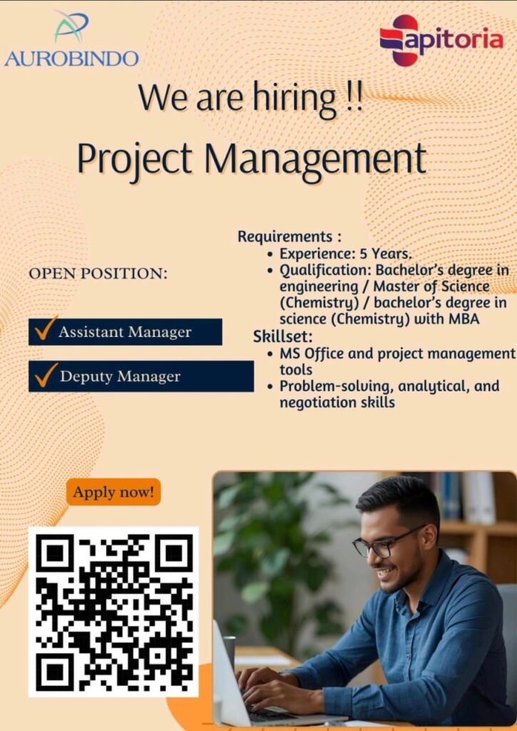 Aurobindo Pharma, through its dedicated API division Apitoria, has announced new job openings for experienced professionals in its Project Management department. This recruitment drive is a significant opportunity for individuals with a background in engineering or chemistry to advance their careers in the pharmaceutical industry.