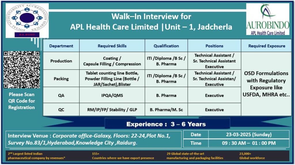 Required Skills: OSD Formulations with Regulatory Exposure like USFDA, MHRA etc…