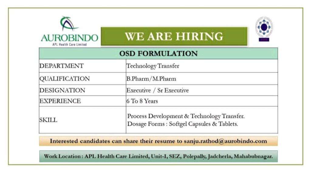 Interested candidates can share their resume to sanju.rathod@aurobindo.com