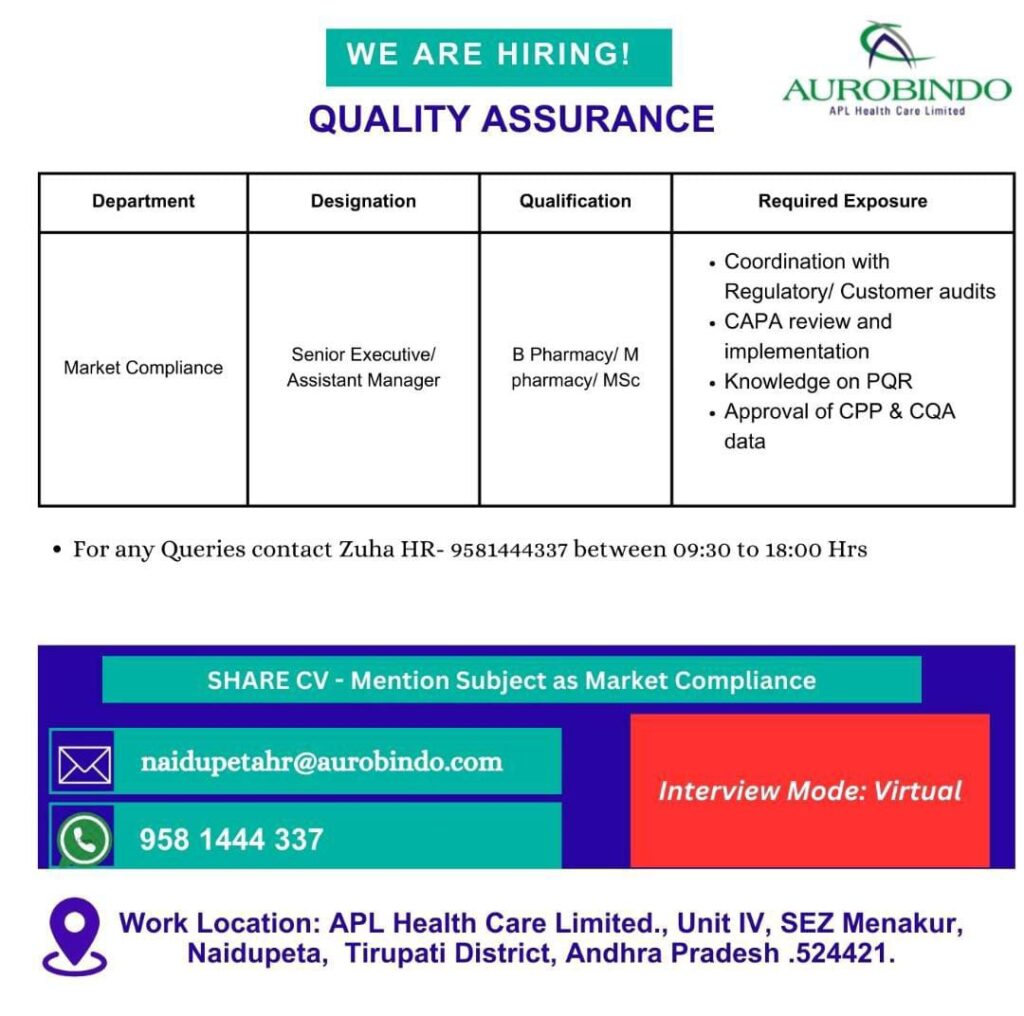 Work Location: APL Health Care Limited., Unit IV, SEZ Menakur, Naidupeta, Tirupati District, Andhra Pradesh .524421.