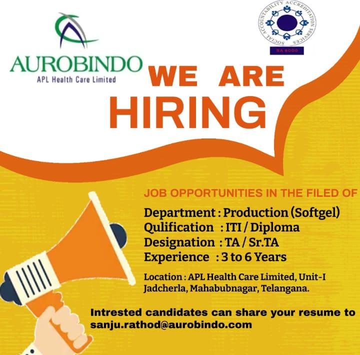 Intrested candidates can share your resume to sanju.rathod@aurobindo.com