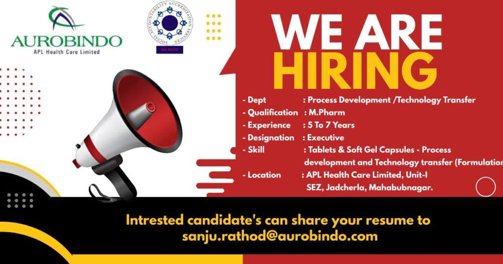 Aurobindo Pharma hiring for TA/ Sr.TA/ Executive- Process Development /Technology Transfer/ Production department – Apply Now