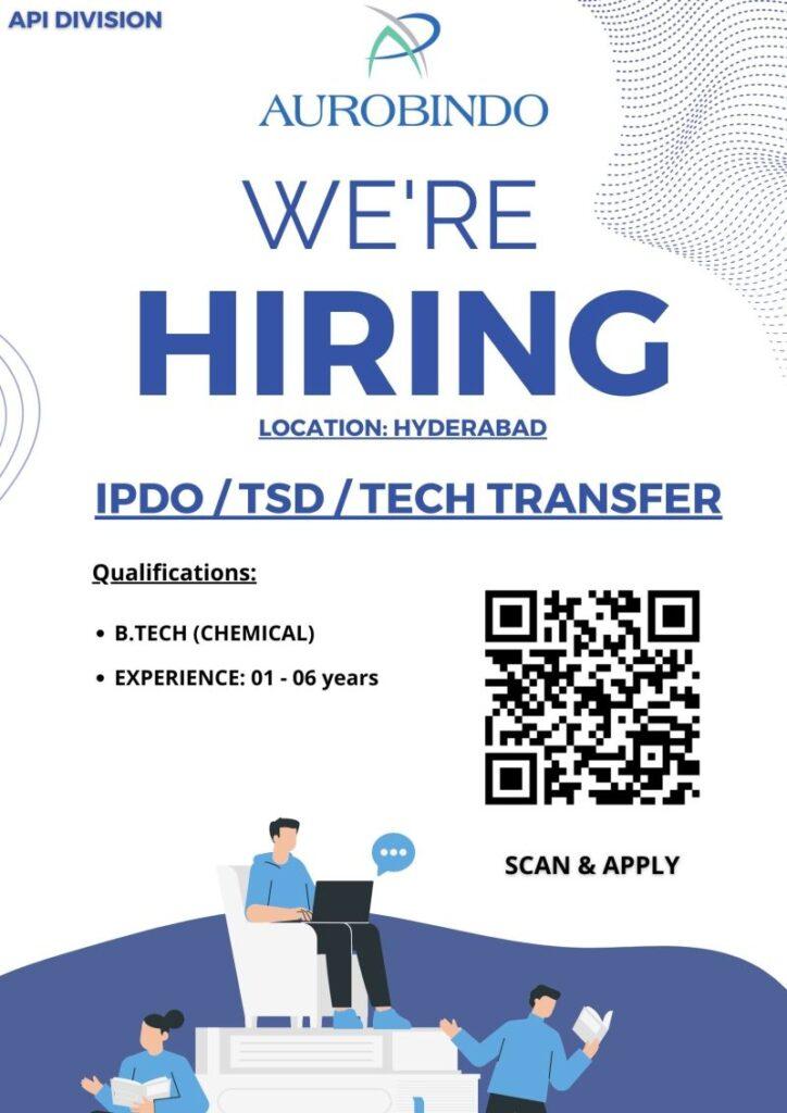 We are looking for B.Tech Chemical candidates in TSD/IPDO/Tech Transfer department for Hyderabad locations. Interested candidates can scan to apply.