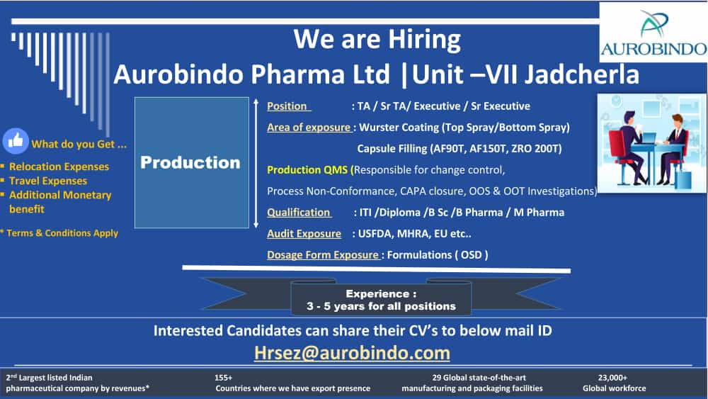 Aurobindo Pharma Ltd | Unit -VII Jadcherla hiring for Production department