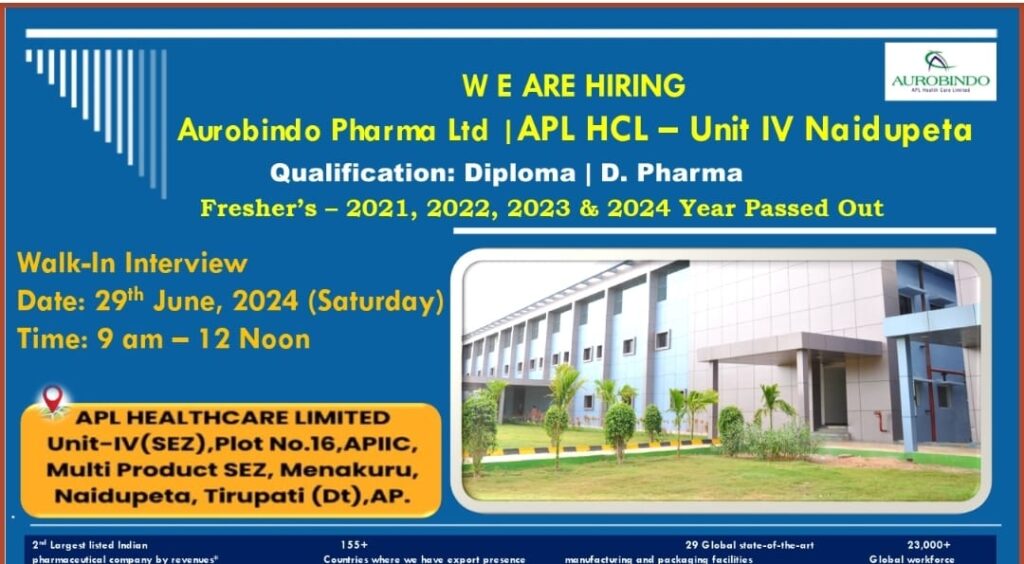 Aurobindo Pharma Ltd Walk-In Interview for Diploma | D. Pharma Fresher’s on 29th June, 2024 (Saturday)