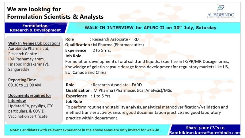 Aurobindo Pharma Ltd Walk In Interview for FARD, FARD department on 30th July 2022
