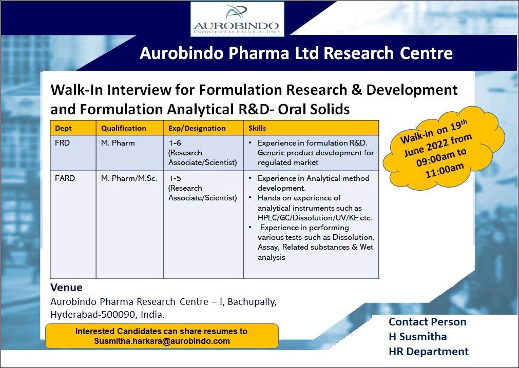 Aurobindo Pharma Ltd Research Centre Walk-In Interview for Formulation Research & Development and Formulation Analytical R&D- Oral Solids on 19th June 2022