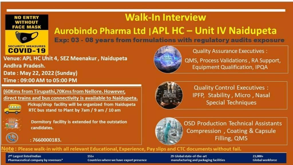 Aurobindo Pharma Ltd Walk In Interview for QA, QC & OSD Production on May 22, 2022 (Sunday)