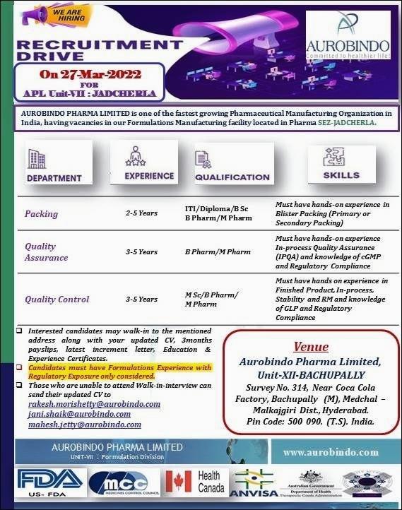 Candidates must have Formulations Experience with Regulatory Exposure only considered. OR Those who are unable to attend Walk-in-interview can send their updated CV to rakesh.morishetty@aurobindo.com