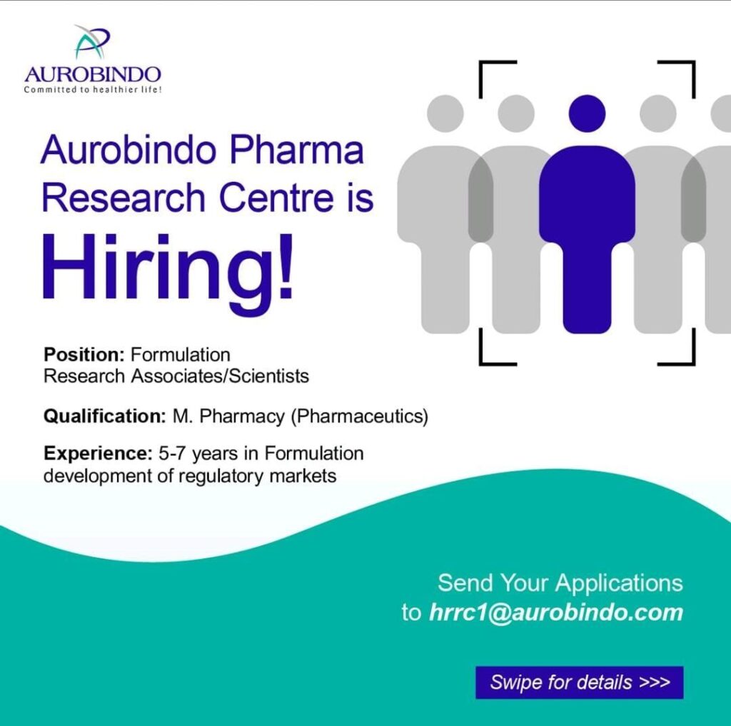 Aurobindo Pharma Research Centre is Hiring!Formulation Research Associates/ Scientists