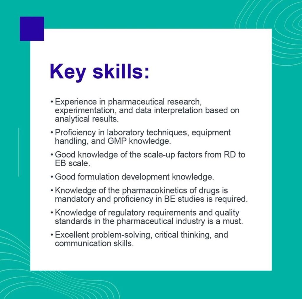 • Proficiency in laboratory techniques, equipment handling, and GMP knowledge.