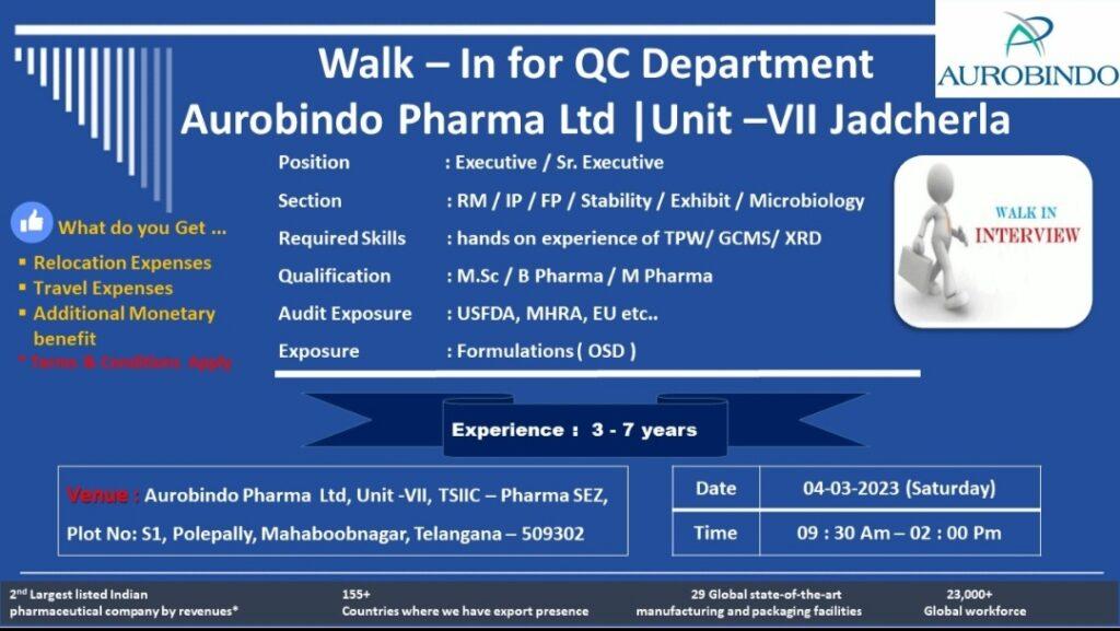 Aurobindo Pharma- Walk In Interview for Executive / Sr. Executive- QC Department