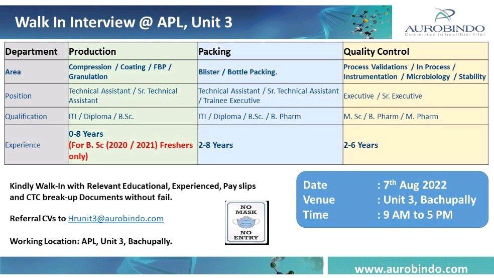 Aurobindo Pharma Walk In Interview for Freshers & experience in Quality Control, Production & Packing on 7th Aug 2022