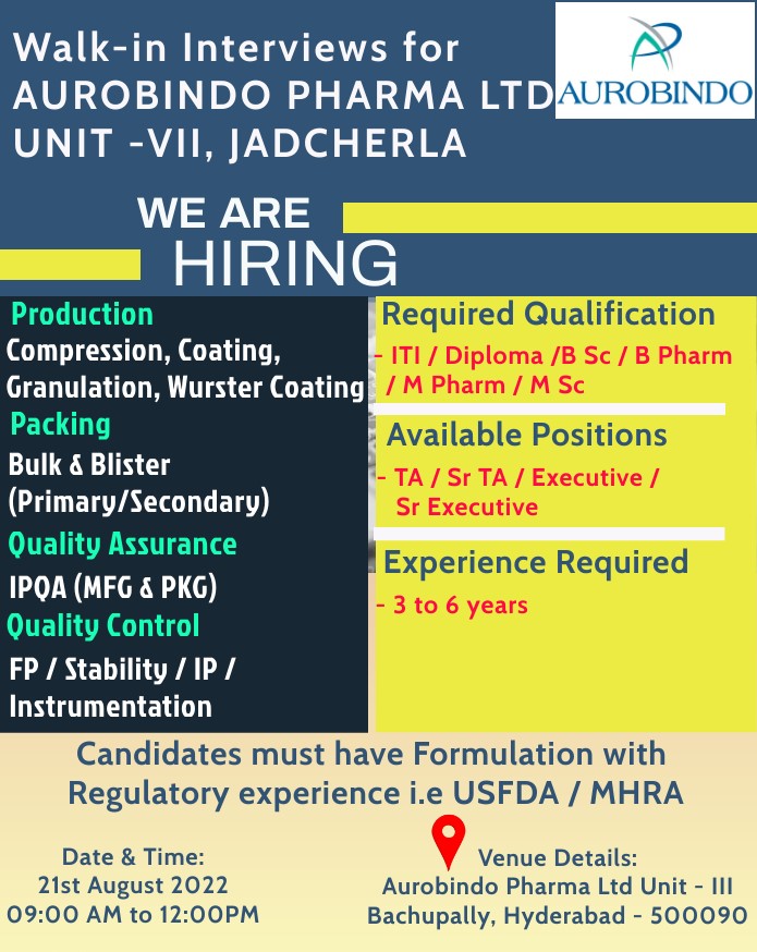 Aurobindo Pharma Walk-in Interviews for Production, Packing, Quality Assurance & Quality Control department on 21st August