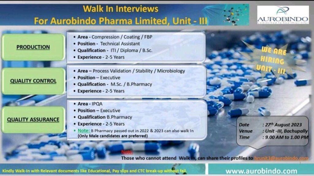 Aurobindo Pharma- Walk In Interviews for QA, QC & Production on 27th August 2021