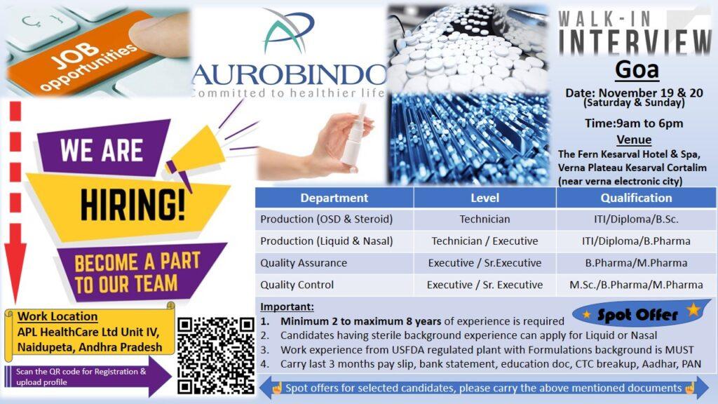 AUROBINDO Walk In Interview for Production (OSD & Steroid, Liquid & Nasal), Quality Assurance & Quality Control department on November 19 & 20 (Saturday & Sunday)