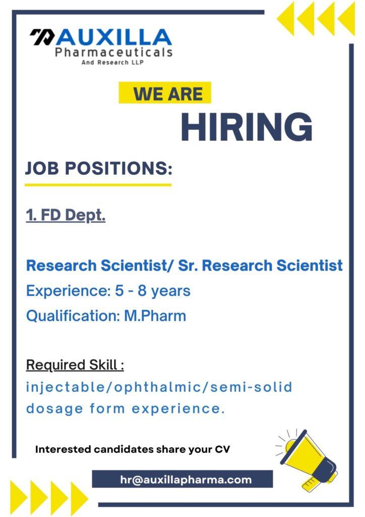 Auxilla Pharma hiring for Research Scientist/ Sr. Research Scientist (FD Dept.) Apply now