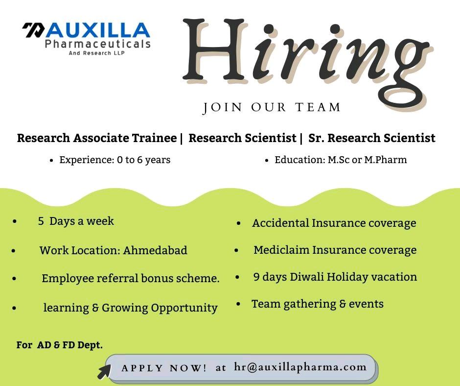 Auxilla Pharmaceuticals and Research hiring M.sc/M.Pharm /Ph.D Freshers for Research Associate -Trainee/Research Scientist/Sr. Research Scientist in AD & FD Department.