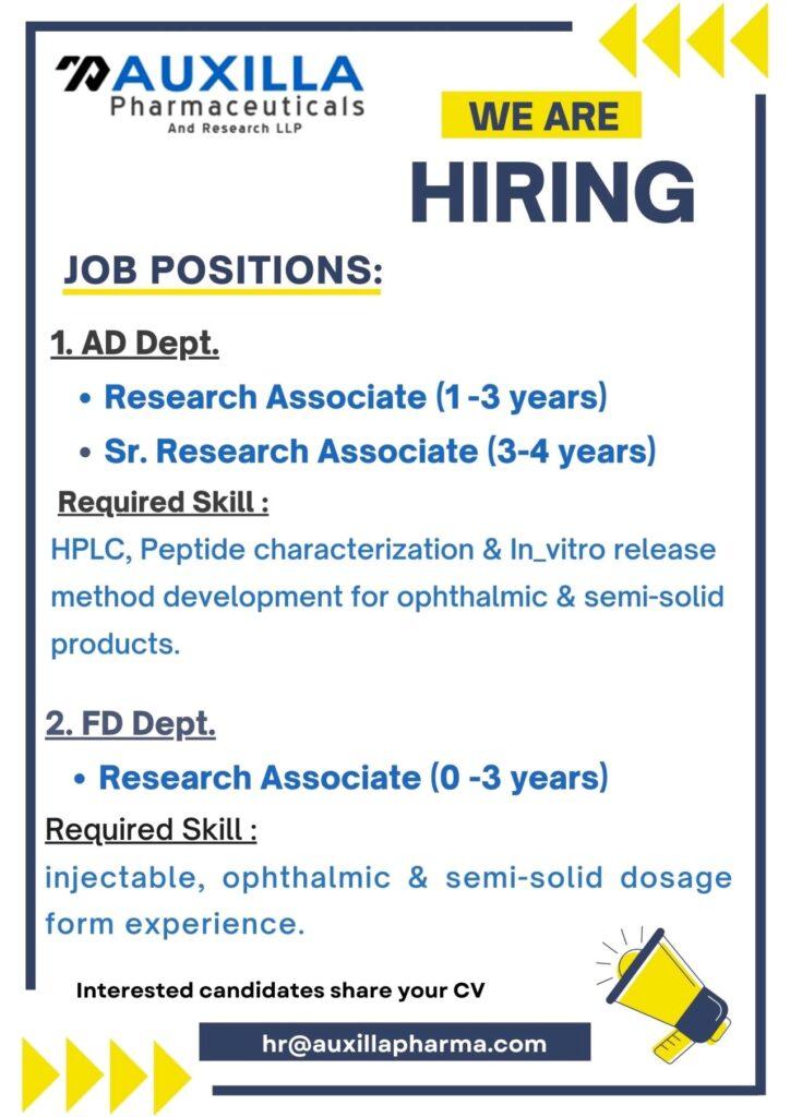 Auxilla Pharmaceuticals hiring Freshers & experience for AD & FD Department