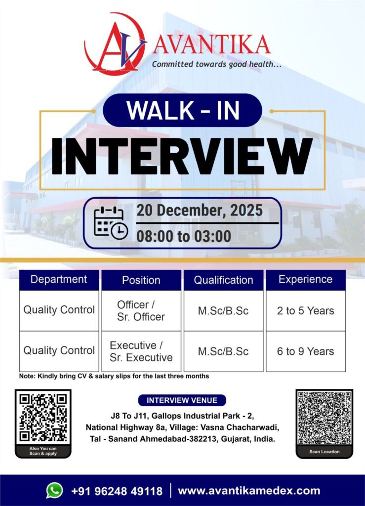 Avantika Medex, a company committed towards good health, has announced a walk-in interview drive for pharmaceutical professionals. The recruitment focuses on expanding their Quality Control department at their facility in Gujarat.