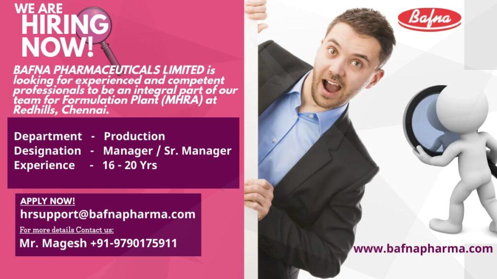 Bafna Pharmaceuticals Limited job vacancy for Manager/ Sr. Manager Production department