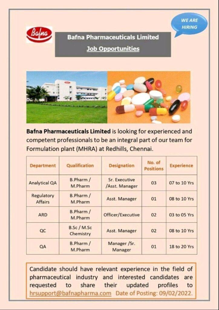 Bafna Pharmaceutical Limited is hiring experienced professionals for Formulation Plant (MHRA) at Redhills, Chennai.