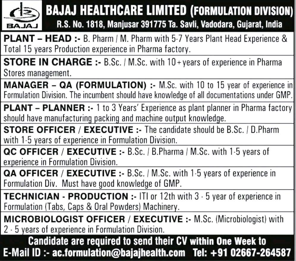 Candidate are required to send their CV within One Week to E-Mail ID:- ac.formulation@bajajhealth.com Tel: +91 02667-264587