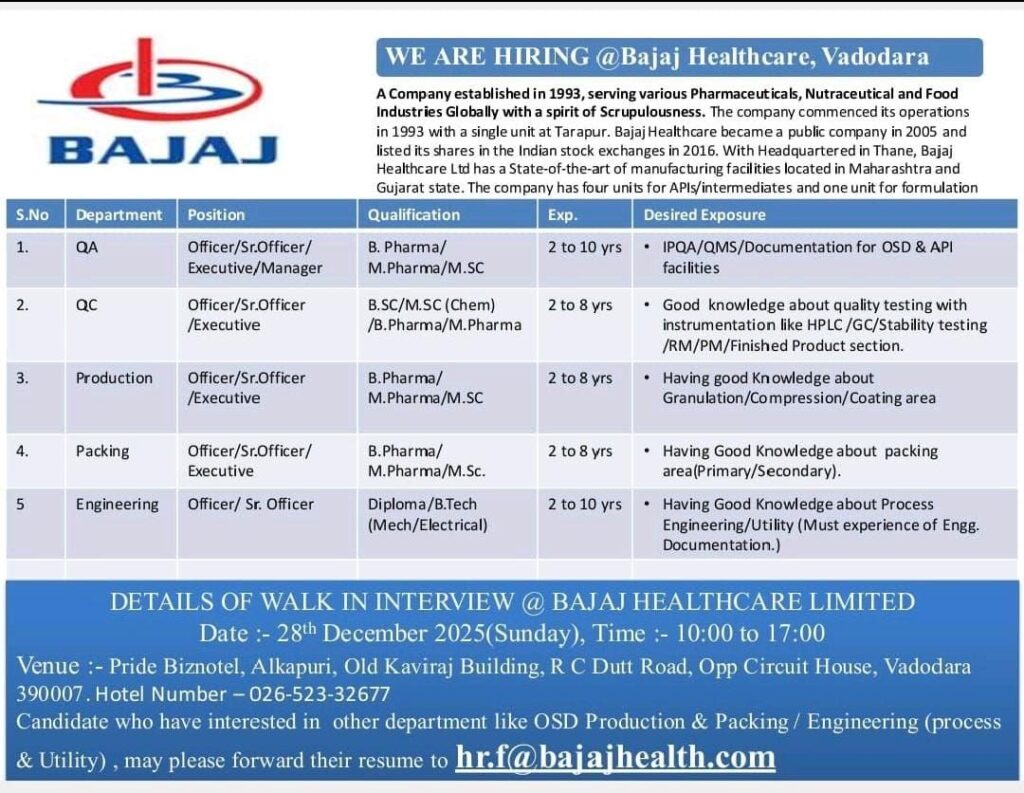 Bajaj Healthcare Limited, a leading name in the pharmaceutical, nutraceutical, and food industries since 1993, has announced an extensive walk-in recruitment drive. With a strong global presence and state-of-the-art manufacturing facilities across Maharashtra and Gujarat, the company is looking for experienced professionals to join its Vadodara team.