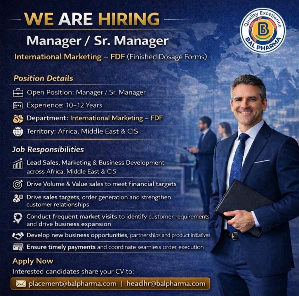 Bal Pharma is currently expanding its team and seeking experienced professionals for leadership roles in its International Marketing – Finished Dosage Forms (FDF) division. This is an excellent opportunity for seasoned marketing experts to join a growing pharmaceutical organization and manage key global territories.