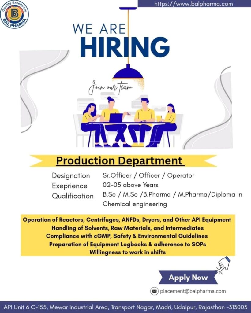 Bal Pharma Ltd., a leading pharmaceutical company known for its quality excellence and innovation, is inviting skilled and dedicated professionals to join its Production Department at the API Unit 6, Mewar Industrial Area, Transport Nagar, Madri, Udaipur, Rajasthan.