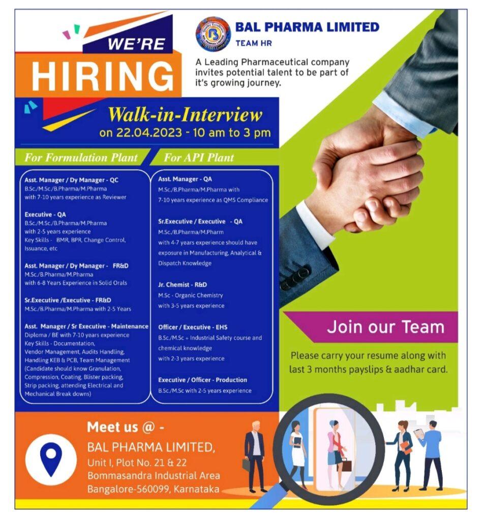 BAL PHARMA – Walk In Interview for API & Formulations- QA, QC, FR&D, EHS, Production, Maintenance on 22/04/2023