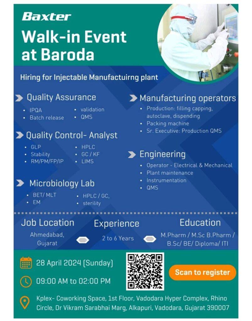 Baxter Walk-in interview for QA, QC, Microbiology, Manufacturing & Engineering on 28th April 2024 (Sunday)