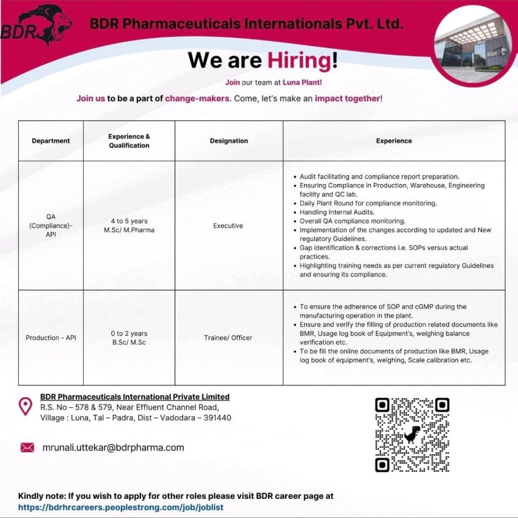 BDR Pharmaceuticals Internationals Pvt. Ltd., a leading name in the pharmaceutical industry known for its innovative API and formulation capabilities, has announced new job openings at its Luna Plant (Vadodara, Gujarat). The company is inviting eligible candidates to join its growing team and contribute to high-quality pharmaceutical manufacturing and compliance operations.