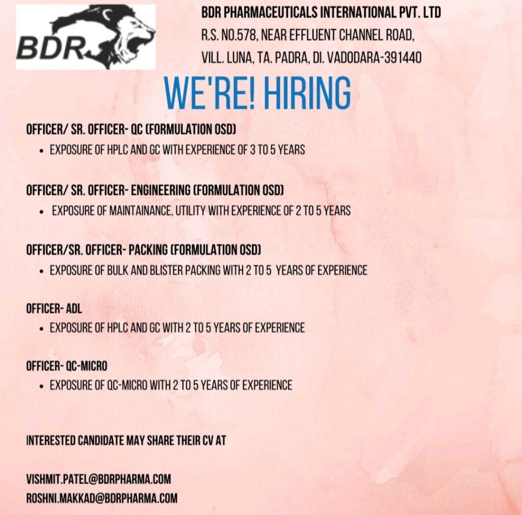 BDR PHARMACEUTICALS Job vacancy for ADL, QC, Micro, Packing & Engineering department