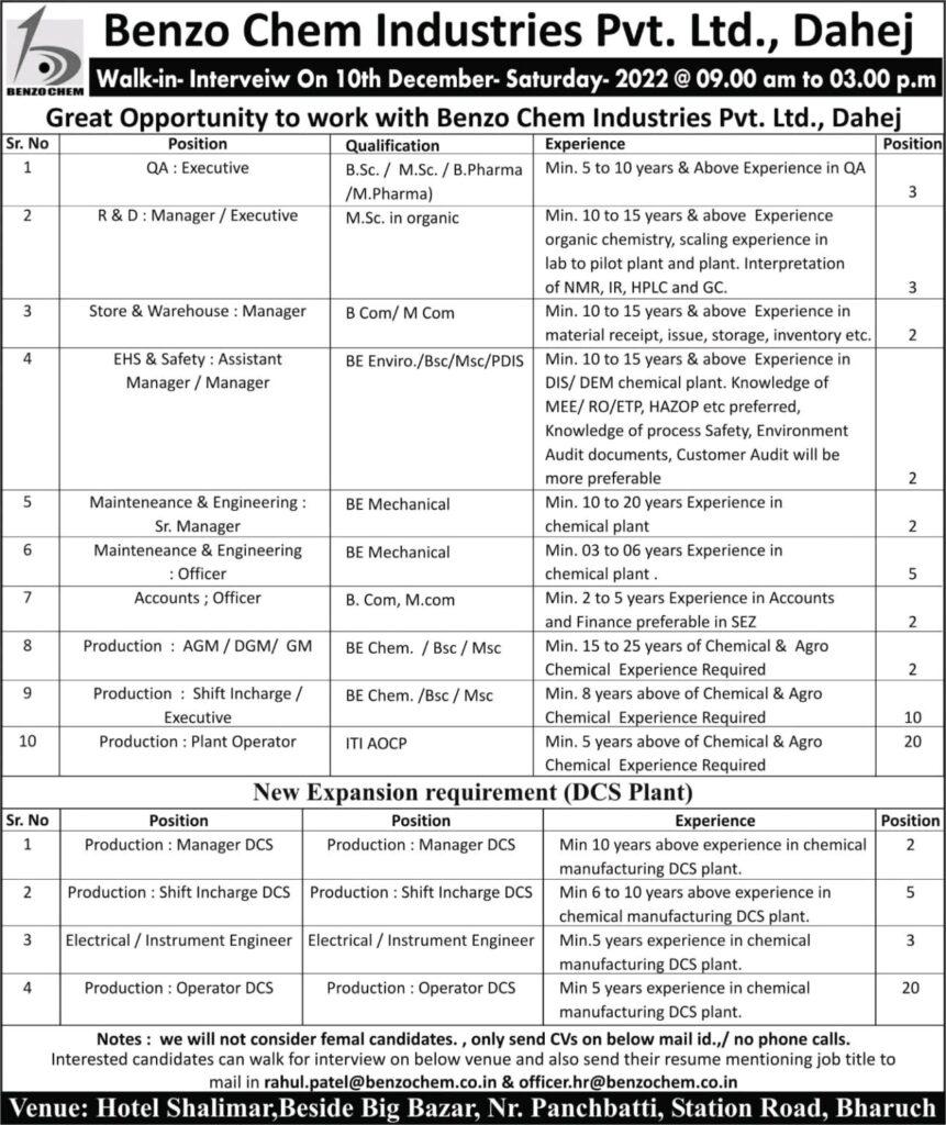 Benzo Chem Industries Walk-in-Interveiw On 10th December 2022 (QA, R&D, Store & Warehouse, EHS & Safety, Accounts, Production, Mainteneance & Engineering)