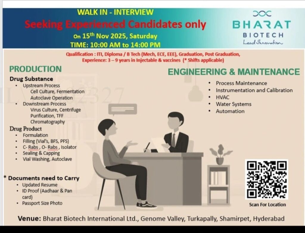 Bharat Biotech, a global leader in vaccine innovation, has announced a walk-in interview exclusively for experienced candidates in Production and Engineering & Maintenance departments. The drive will be held on 15th November 2025 (Saturday) at the company’s facility in Genome Valley, Hyderabad.