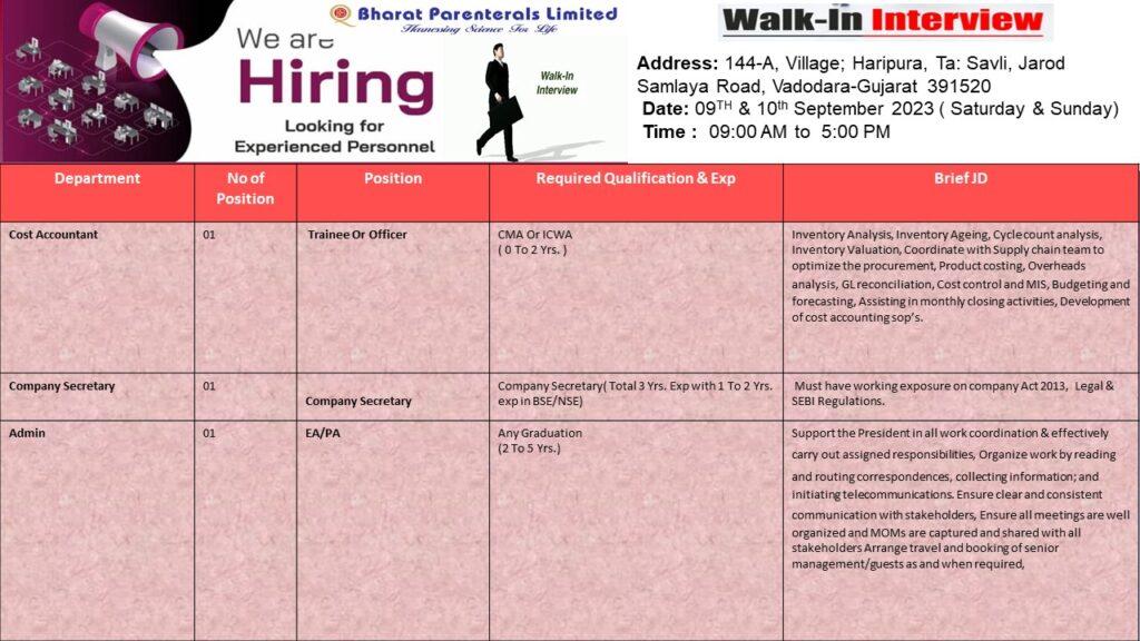 Bharat Parenterals Limited Walk In Drive on 09th & 10th September 2023 ( Saturday & Sunday)