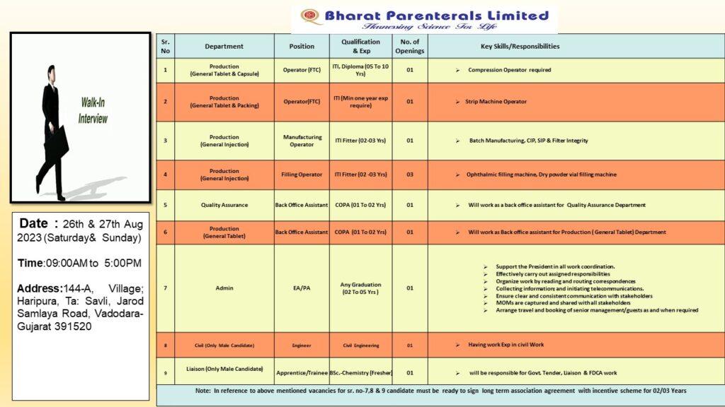 Bharat Parenterals Limited Walk In Drive on 26th & 27th Aug 2023 (Saturday & Sunday)