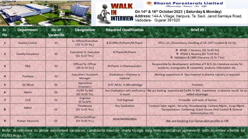 Bharat Parenterals Limited walk in interview for Freshers & experience @ Vadodara |14th & 16th October 2023