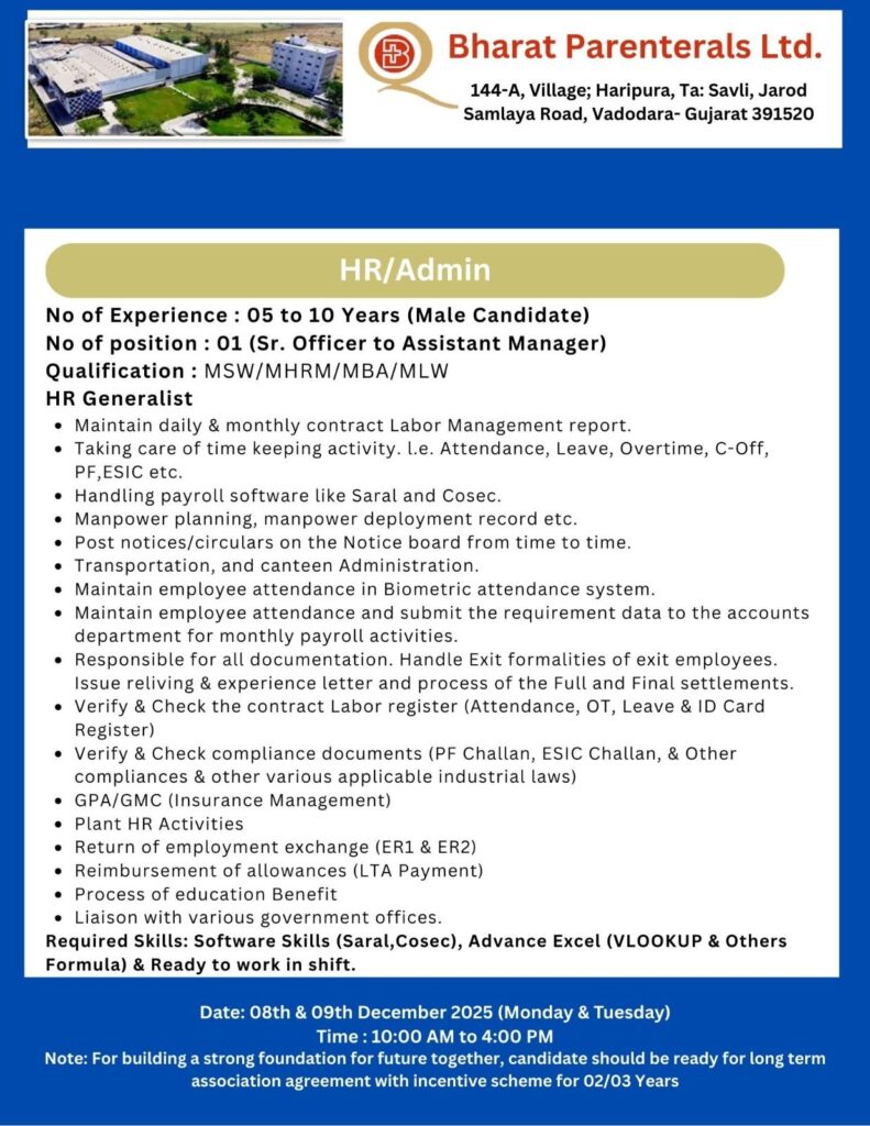 Bharat Parenterals Ltd., a well-established pharmaceutical company based in Vadodara, Gujarat, has announced an excellent career opportunity for experienced HR professionals. The company is seeking a qualified and dynamic candidate for the position of HR/Admin (Sr. Officer to Assistant Manager). With a legacy of growth and commitment to quality, Bharat Parenterals is inviting capable professionals to join its team and contribute to its continued success.