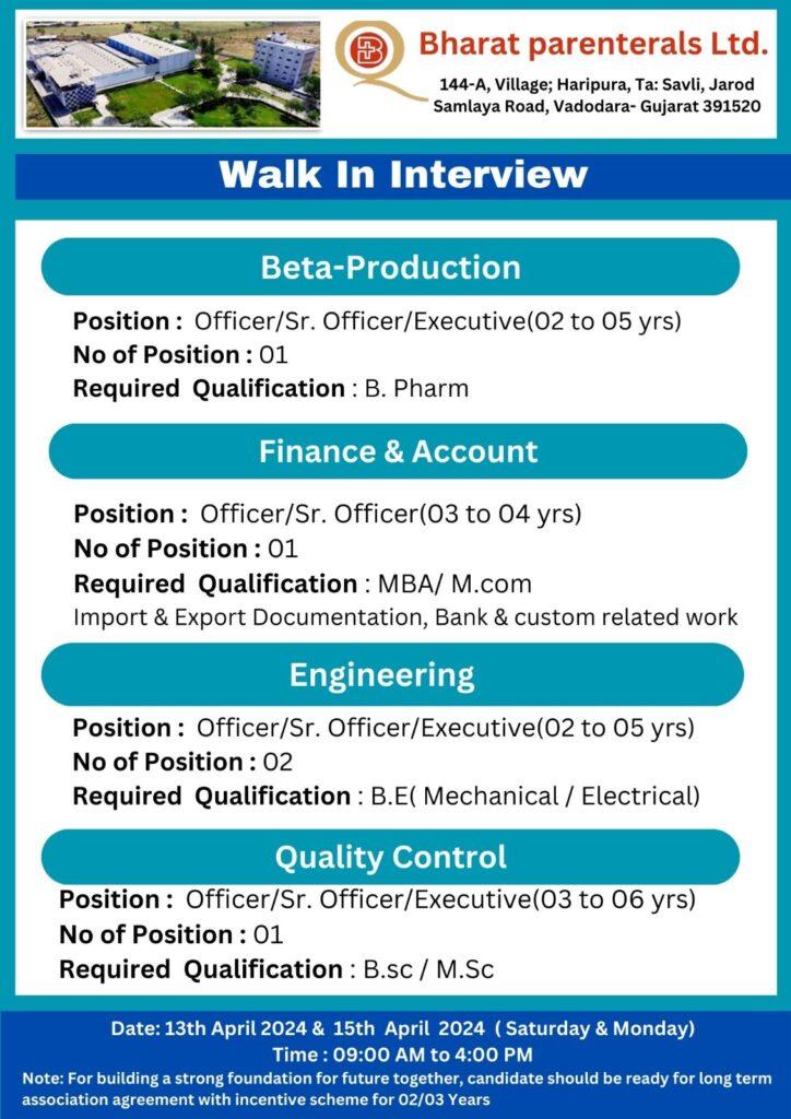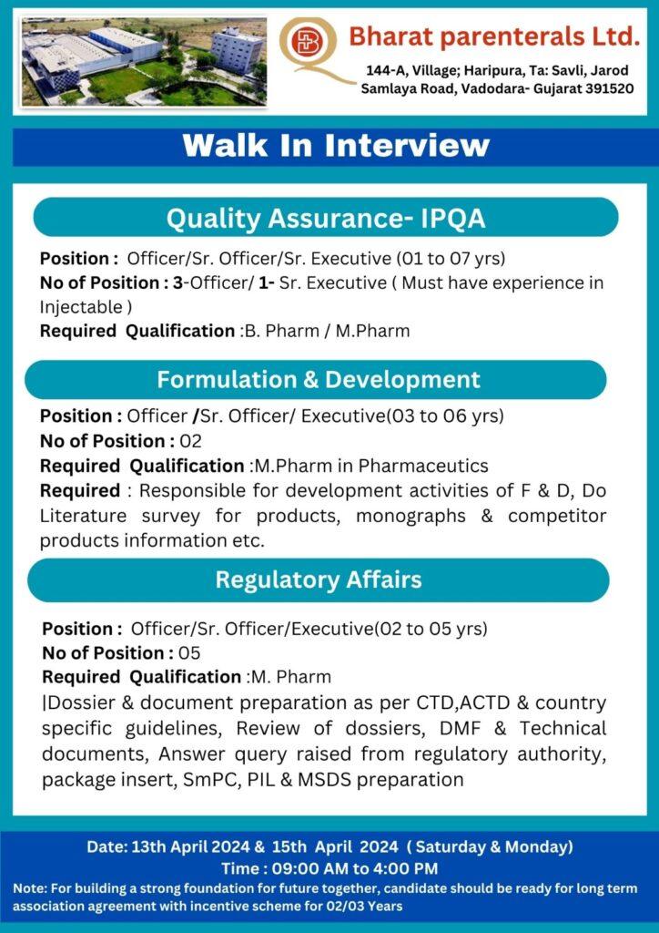 Bharat Parenterals Ltd Walk In Interview for QA, QC, Production, RA, F&D, Engineering, Finance & Account on 13th & 15th April 2024