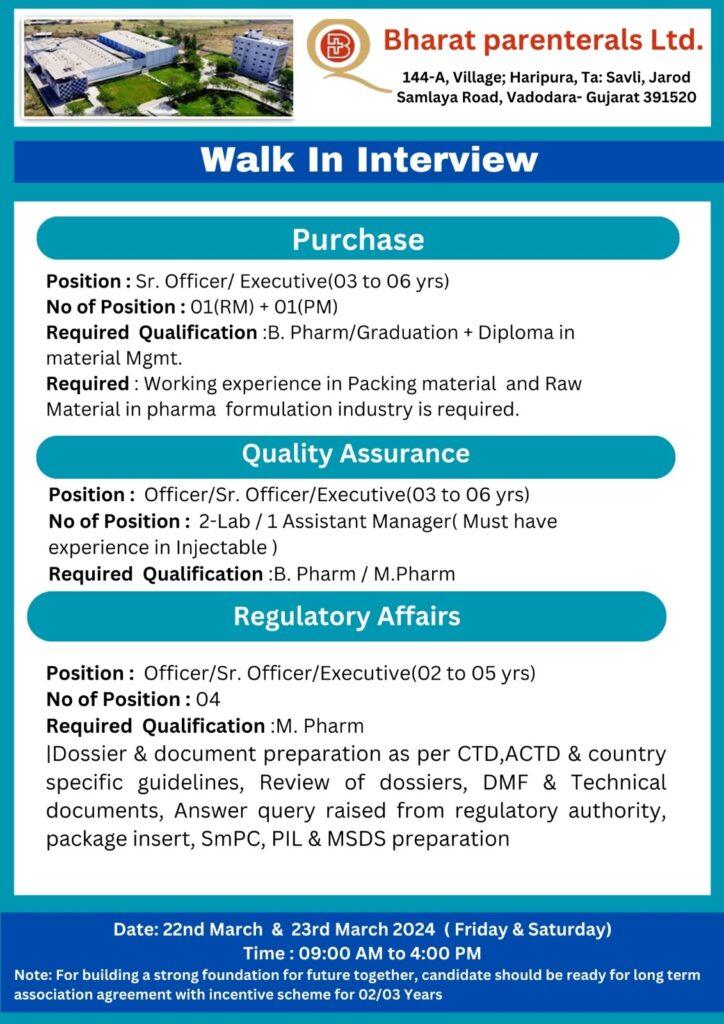 Bharat Parenterals Walk In Interview for Purchase, QA & Regulatory Affairs on 22nd & 23rd March 2024