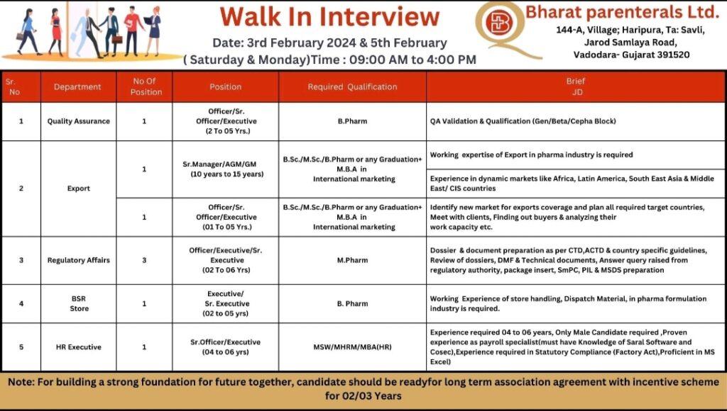 Bharat Parenterals walk in interview for QA, RA, Export, BSR Store, HR Executive on 3rd & 5th February 2024