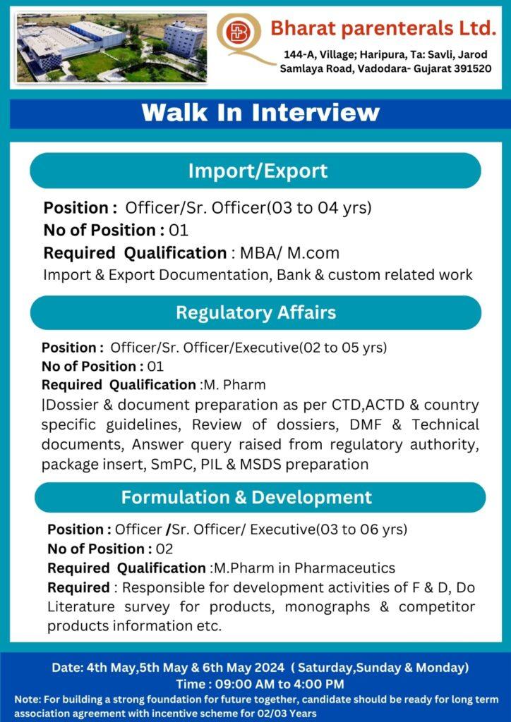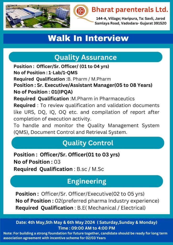 Bharat Parenterals Walk In Interview for RA, QA, QC, Engineering, Import/ Export, Formulation & Development on 5th May & 6th May 2024