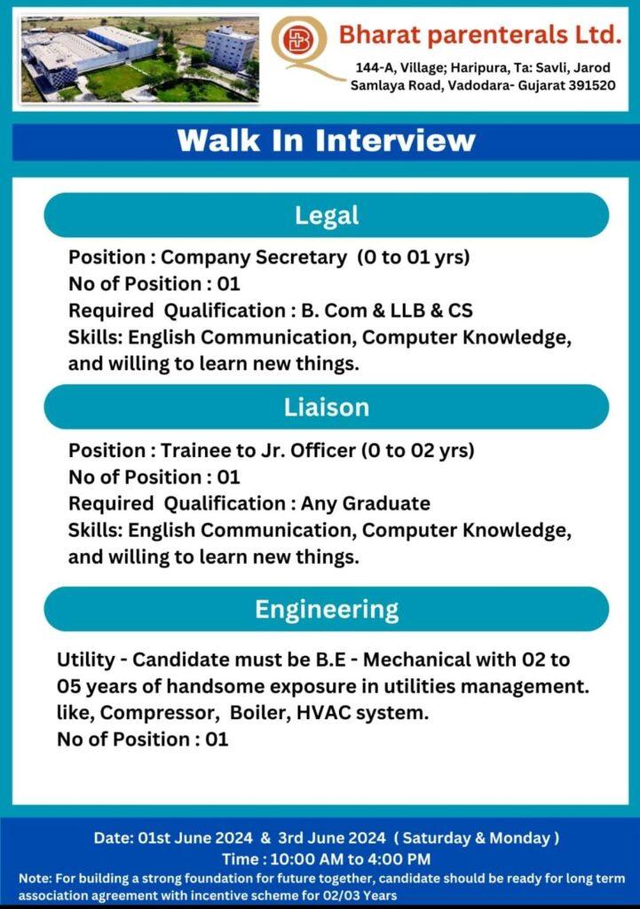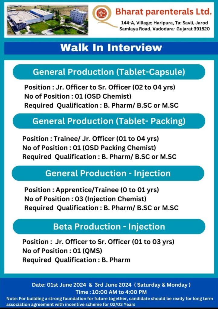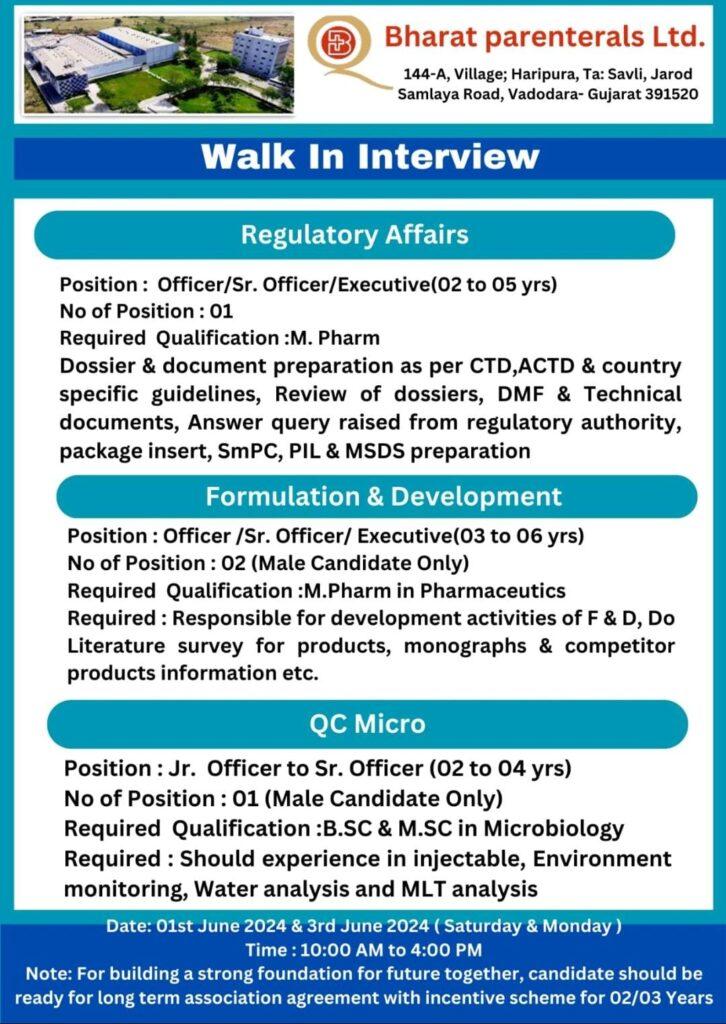 Bharat Parenterals Walk In Interview for Regulatory Affairs, F&D, Micro, Production, Engineering, Liaison on 01st & 3rd June 2024