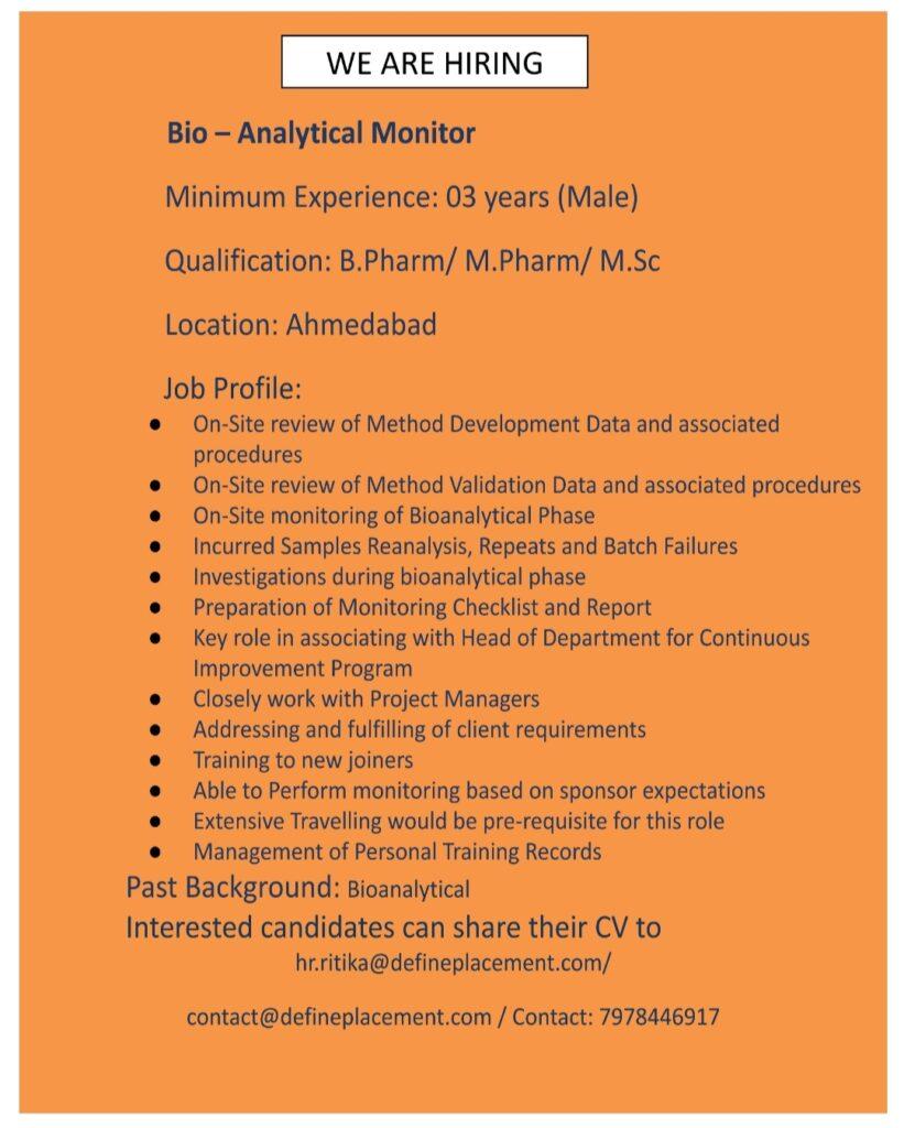 Bio –Analytical Monitor -Job vacancy at Ahmedabad location – Apply Now