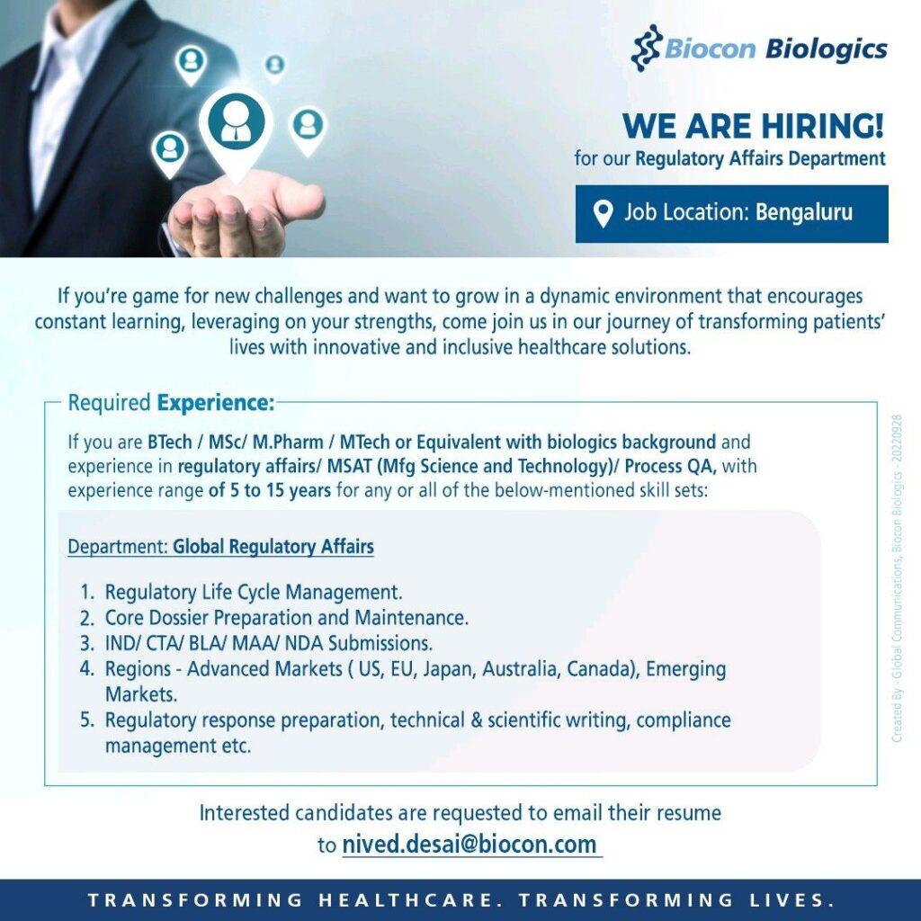 Biocon Biologics hiring for Global Regulatory Affairs Department