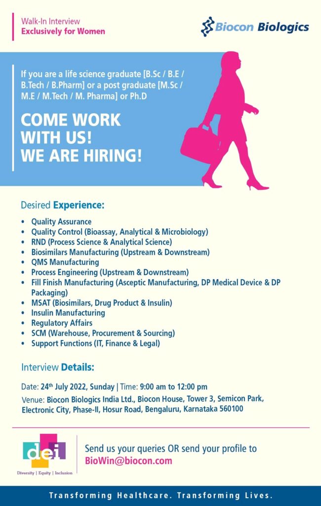Biocon Biologics India Limited Walk In Interview for B.Sc / BE / B.Tech / B.Pharma / M.Sc / ME / M.Tech / M.Pharma or Ph.D. candidates on July 24, 2022
